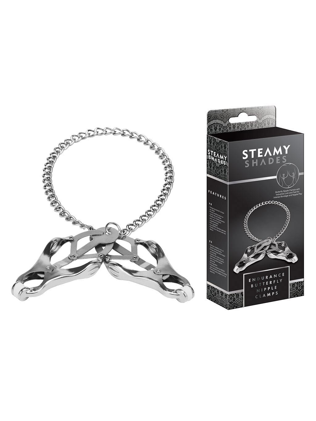 Unique industrial design. metal design. coated tips for comfort. attached by metal chain that dangles against the chest. non-adjustable. intense advanced BDSM play. perfect for nipple play.