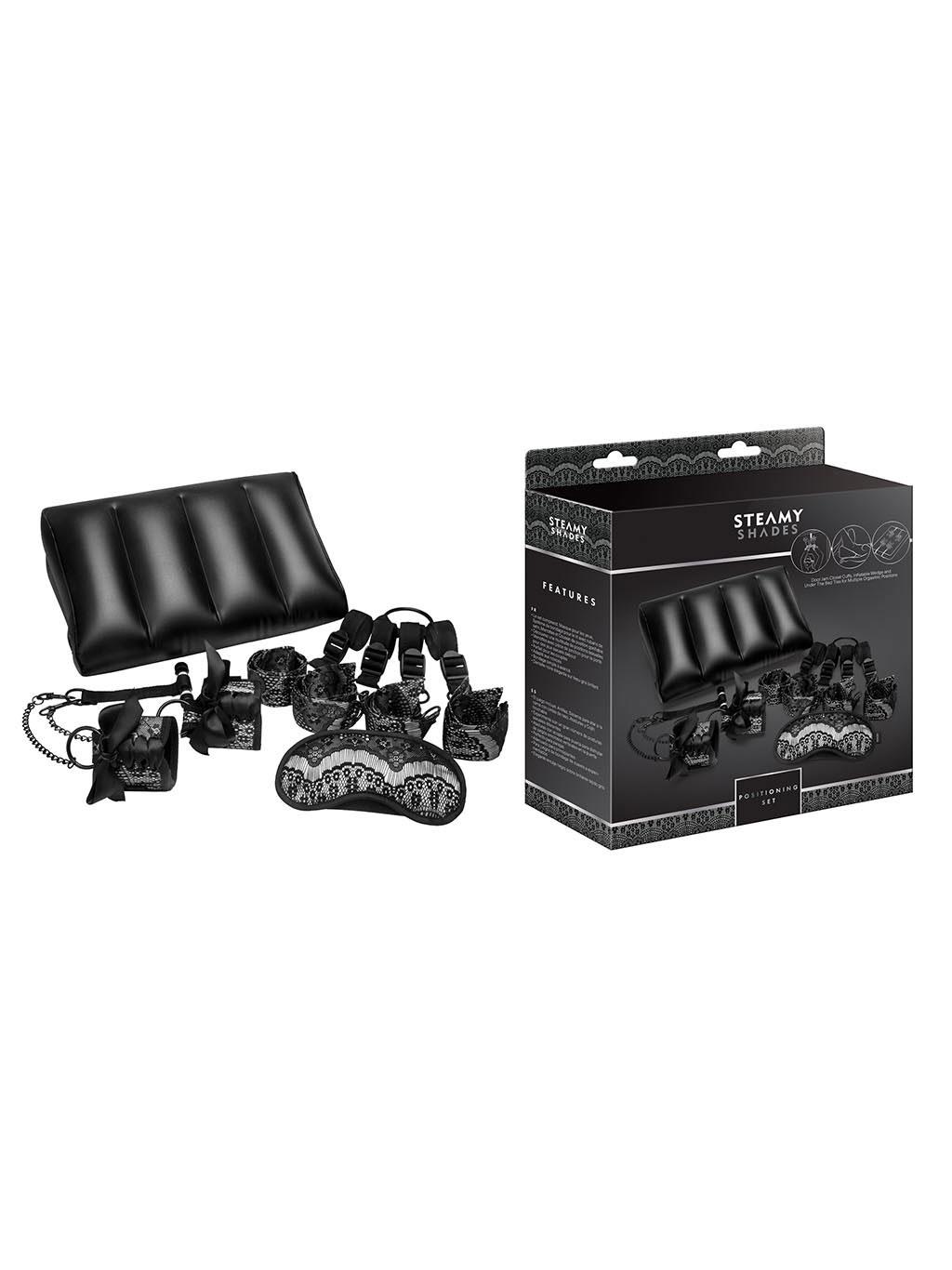 Set includes: Eye mask. Satin Ties Bed Restraint Kit. Door Jam Closet Cuffs and Inflatable Position Wedge. offers a variety of positioning options. door Jam Closet Cuffs allow for vertical intimate play and feature elegant corset lace-up detail. perfect for couples. beginners friendly. light to intermediate bondage. elegant sheer black lace overlay on grey fabric.