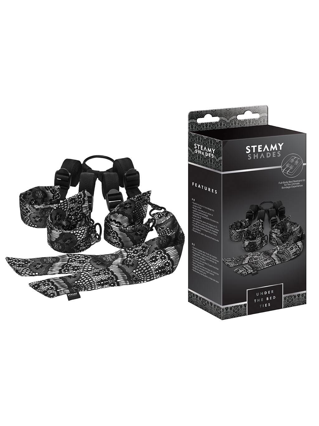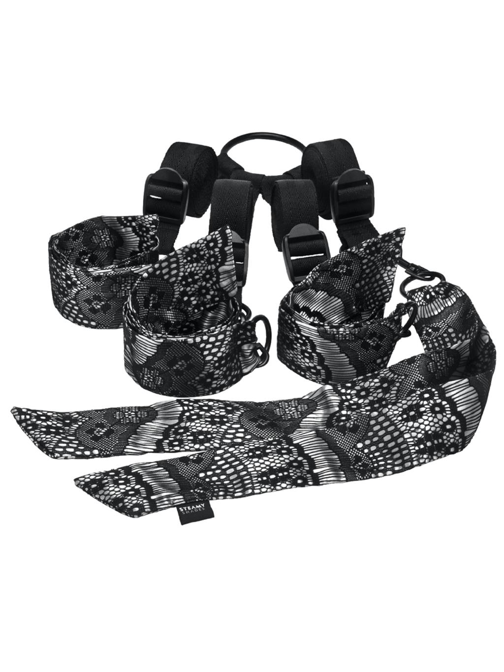 Full-body restraint system. adjustable to fit any size bed. D-ring connectors allow for easy set-up. tucks easily under any mattress. elegant sheer black lace overlay on lustrous grey fabric. and comes with sensual soft satin ties.